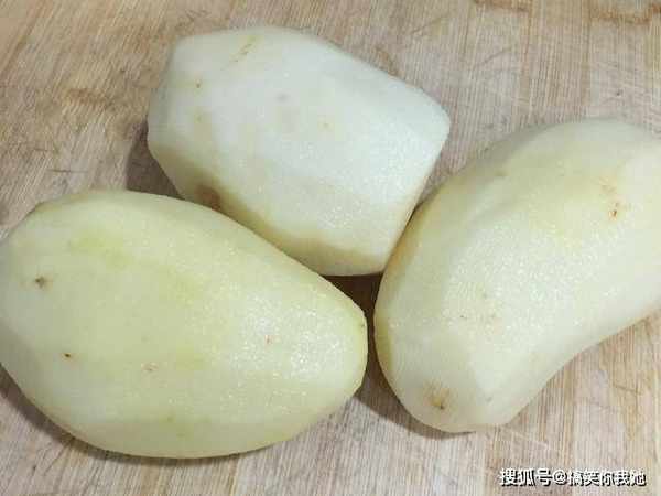 准备3块土豆,刮掉外皮,清洗干净,改刀切成均匀的薄片,厚度不要太薄,中等厚度即可。