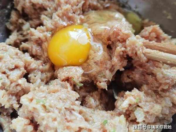倒入攥干的萝卜,与肉馅搅拌在一起,最后打入一颗鸡蛋,再次搅拌均匀,萝卜肉馅就制作完成了,接下来直接包饺子煮熟。
