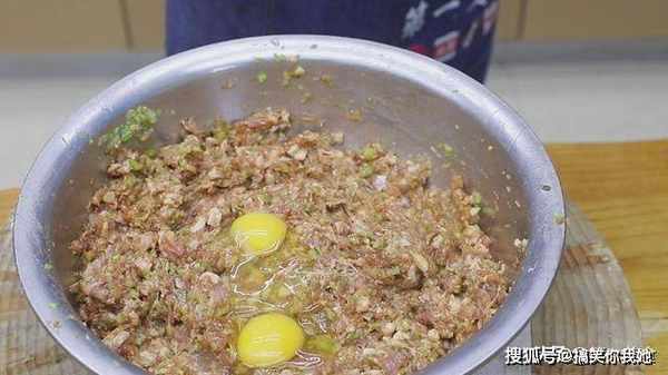 然后打入两个鸡蛋,增加嫩滑的口感也增加了馅料的抱合力。使肉馅更容易成团。
