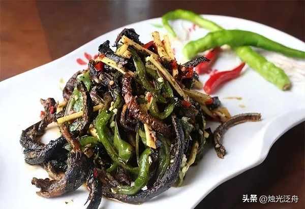 土黄鳝500 克、青二荆条辣椒150克、子姜丝50 克、葱白丝50 克、生清油80 毫升、自制豆瓣30克、老陈醋5毫升。
