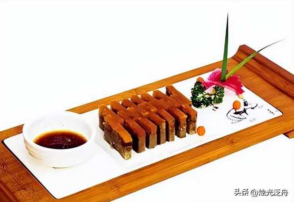 3、取出蒸过的焖子,在表面均匀涂抺1厘米厚的金瓜淀粉糊,盖保鲜膜入笼继续蒸15分钟,取出后切成4×1×1厘米的条,左右交错摆入盘中,用微波炉加热1分钟至回软,带一碗用C料调好的蘸汁即可。