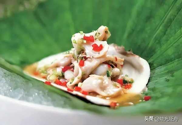 1、将蚌仔治净,放入80℃左右的水中烫20秒,捞出去皮,切成长6厘米、厚0.3厘米的片,然后用加有适量泰国青柠檬片的冰水冰镇1分钟左右。