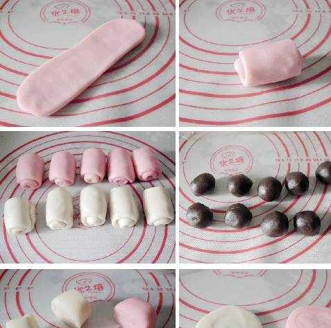 19将粉色油皮放在白色油皮上面,再粉色油皮上放上豆沙。