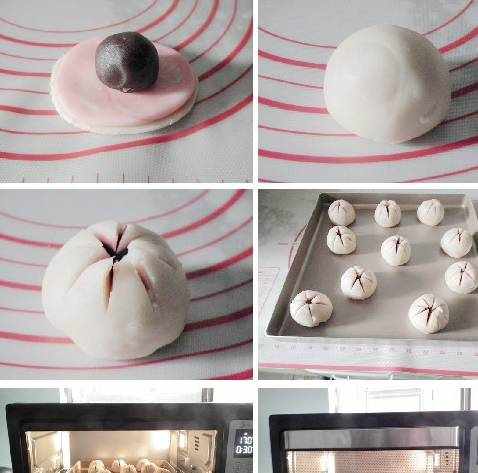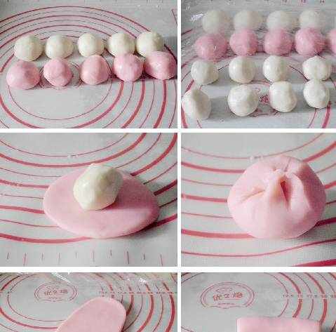 6将油皮面团分成2份,一份加入几点色素揉成粉色面团。