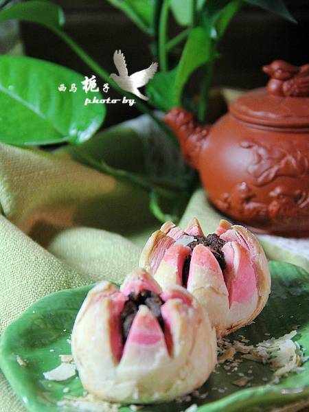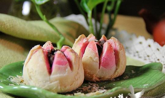 油皮;中筋面粉125克,糖15克,猪油20克,水62克。色素几滴