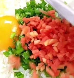 盛出剩米饭,打入一个鸡蛋,再加入适量盐、葱花、胡萝卜丁,搅拌均匀。