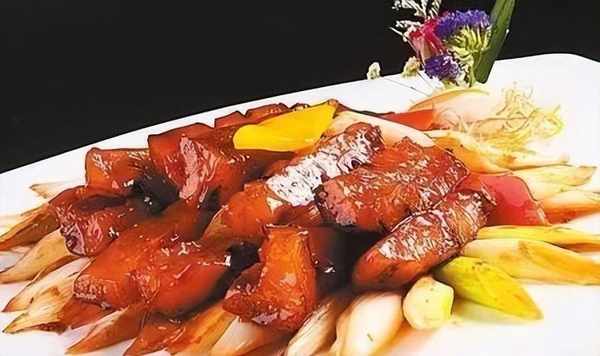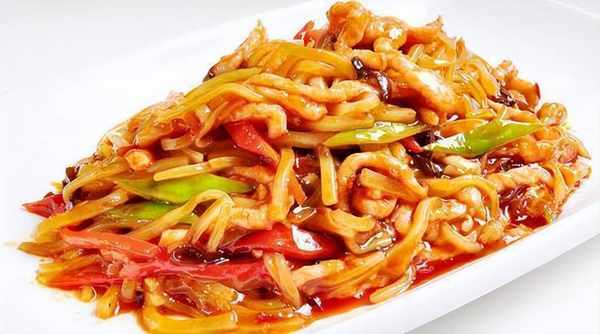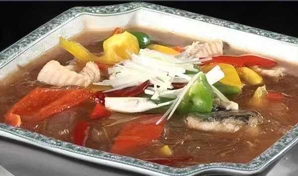 材料:鲜鲤鱼肉300克,干粉皮100克,青柿子椒25克,红辣椒20克,葱10克,甜面酱15克,料酒、酱油、糖色各10克,猪油30克,鸡汤600克,精盐2克,芝麻油10克。
