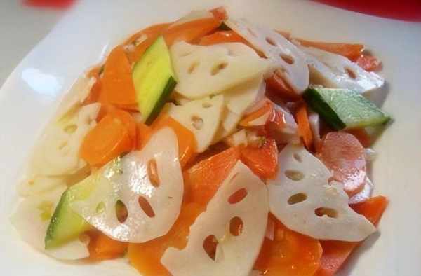 材料:莲藕、胡萝卜、盐、鸡精、葱、姜、蒜、酱油、植物油各适量。