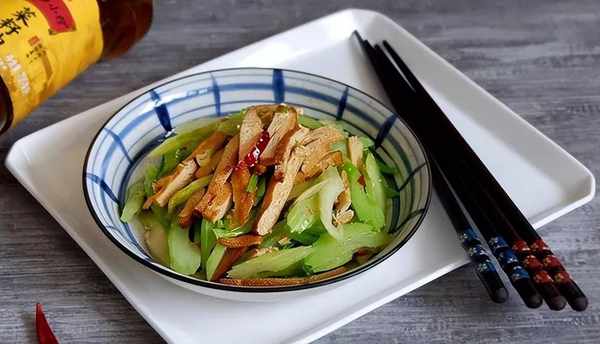 食材:芹菜1棵,香干3片,干辣椒1个,生姜,盐,昆布调味粉