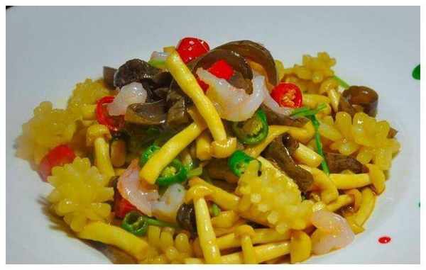 4.热锅后倒入菜油,完全熟后加入泡椒爆炒。等泡椒炒出香味,倒入笋丝、加入少许小茴香提香味就是了。八成熟后加入少许盐,起锅前加入鸡精少许提味即可。
