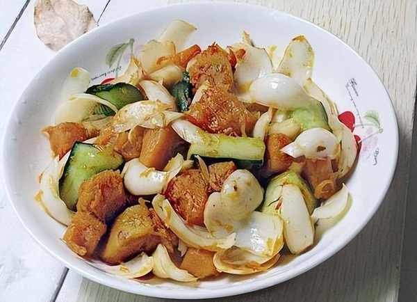 材料:百合、南瓜、青瓜、花生油、食盐、白糖、鸡粉