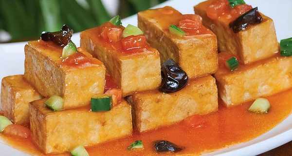 食材:有机豆腐半块、有机香橙 1 只、山药 100 克、盐、糖、黑芝麻、白芝麻、素蚝油汁适量