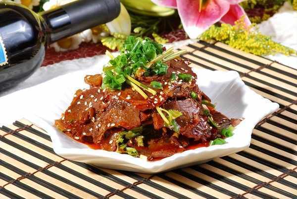 5.牛肉切片,摆盘,撒少许葱丝,倒入调味汁便可上桌