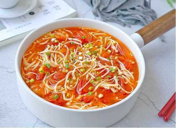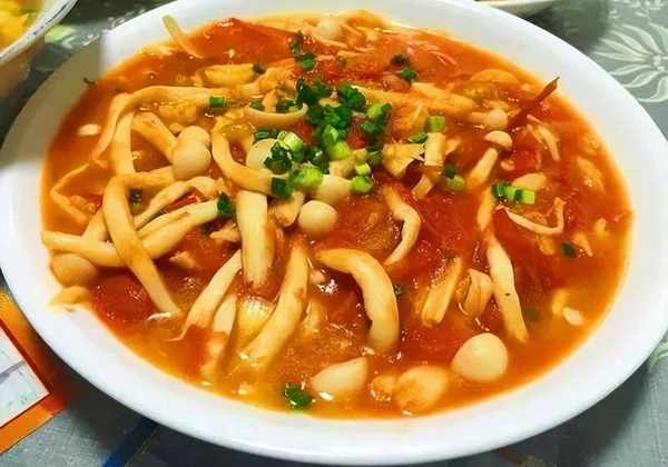 材料:西红柿两个、海鲜菇若干、小葱两根、蒜头两瓣、油、盐、糖