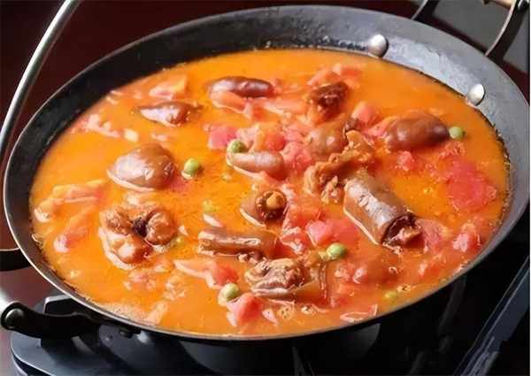 3、另锅掺清水,下姜葱、当归、沙参、牛棒子骨和牛尾,烧开后改文火煨5个小时。锅中放少许油烧热,倒入番茄块翻炒,然后将牛尾连汤倒入锅中烧开,改用小火炖煮15分钟后,放入鸡汁、盐、味精和鸡精,最后加入几颗熟青豌豆点缀色彩即可。