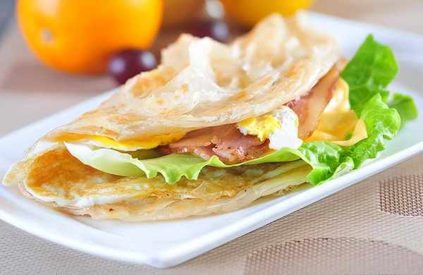 5、再把鸡蛋,火腿,生菜或海带、土豆加在手抓饼上,挤上喜欢的酱料即可。