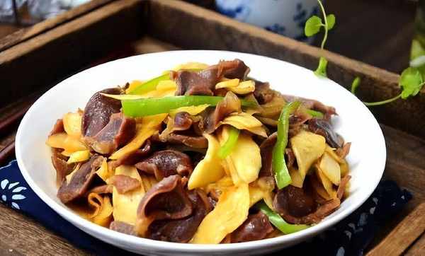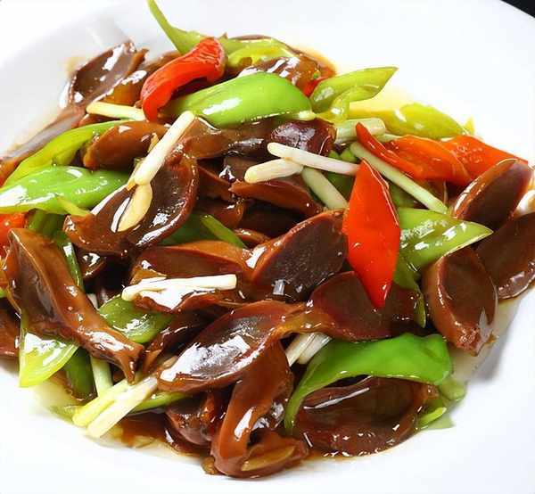 2.茭白切片备用,锅热油放入姜丝炒香,放入鸡胗翻炒,锅中加入生抽、料酒和糖大火爆炒2分钟。