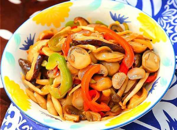6、然后加入海鲜菇翻炒、 再加入杏鲍菇和香菇翻炒;