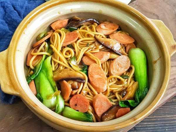 3、锅中放油烧热,加入葱花爆香,接着加入香菇和火腿片炒香,加入油菜叶继续翻炒。加入生抽一勺翻炒。加入面条继续翻炒均匀。