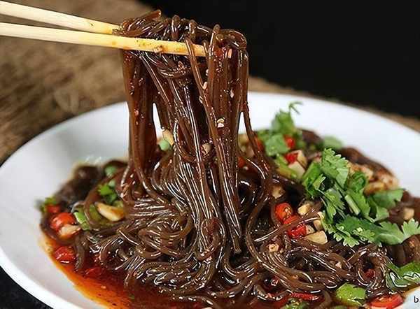 6、将蕨根粉装入盘中,浇上前面调好的酱汁,淋上油辣椒,最后撒上香菜,拌匀就可以吃啦!~