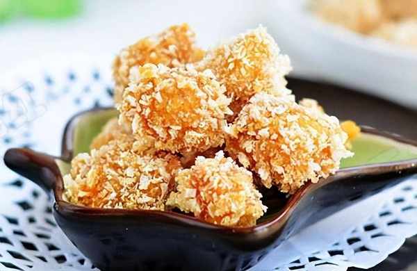 6、锅中放油,油6成热时,放入粘了面包糠的生坯炸制
