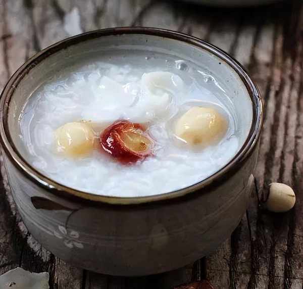 原料:大米(50克)、莲子(10克)、百合(10克)、山楂干(10克)、冰糖(20克)