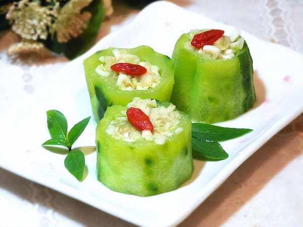 3、在丝瓜的表面上小半匙搅拌过的蒜茸,再在上面放一粒泡过的枸杞籽来装饰;