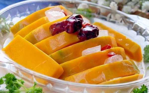 食材:南瓜肉240克,枸杞5克,桂圆肉、红枣、莲子各10克,葡萄干5克,盐3克,白糖15克