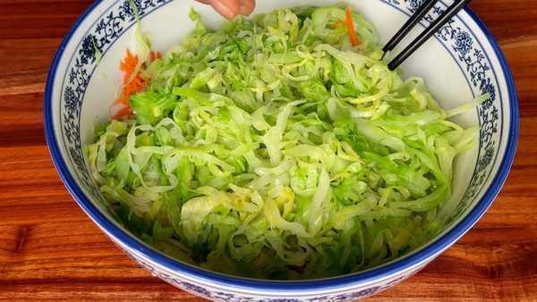 把包菜根部切掉不要,把包菜切成细丝,攥干里面水分。