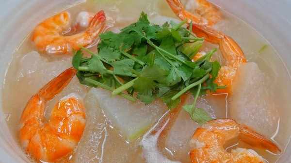 把调料搅拌化开,淋入香油,关火出锅,撒上香菜,冬瓜大虾汤就做好了,做法简单汤鲜味美,清淡有营养。