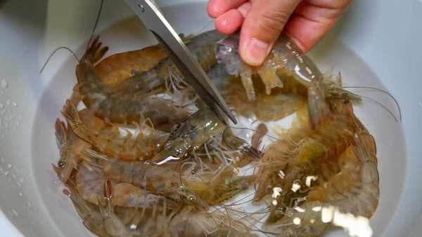 大虾洗净,剪去头部,虾须剪掉不要,用牙签挑出虾线。