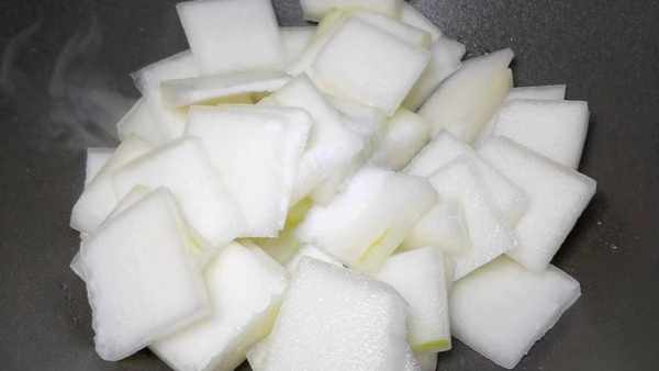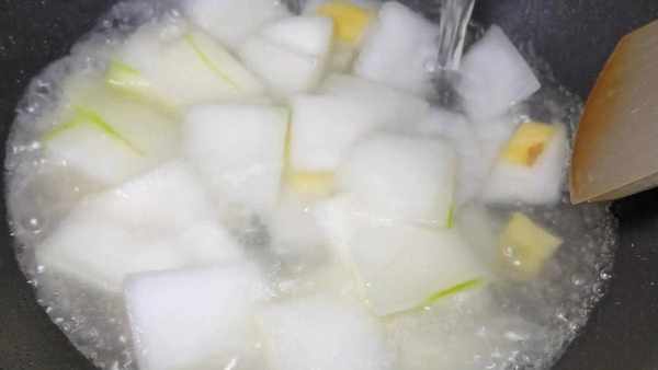 炒锅烧热,淋入一些植物油,油热下入姜片,煸炒几下,加入半勺食盐,继续翻炒均匀,把冬瓜煮烂。