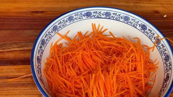胡萝卜洗净,削去外皮,用叉子擦成细丝。