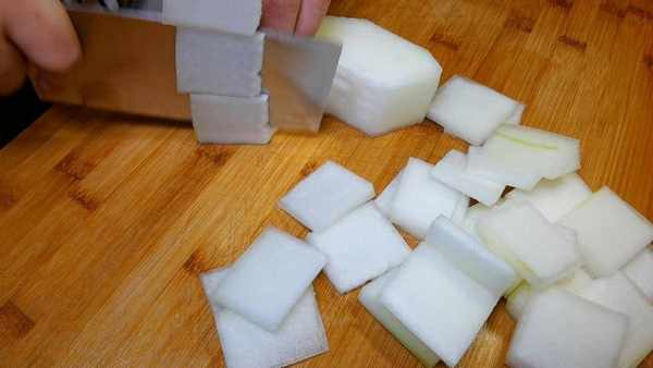 冬瓜一块切去外皮,把冬瓜切成四辦,去掉瓜瓤,洗净把冬瓜切成薄片,切好的冬瓜放入清水中控干水分。