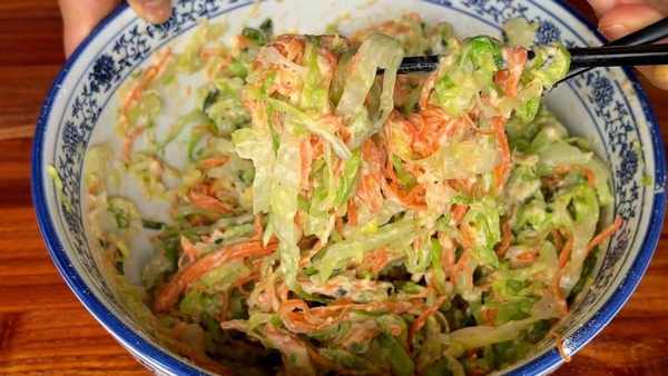 把胡萝卜攥干水分,放在包菜里面,打入一个鸡蛋,调味加入盐,五香粉,胡椒粉,加一把葱花,一勺面粉,用筷子充分搅拌均匀,搅成粘稠面糊。