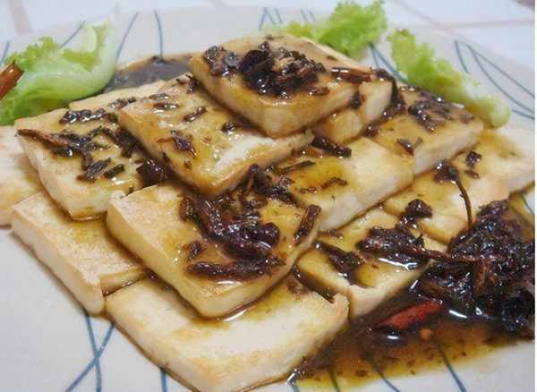 1、豆腐切片,用少许油煎至两面金黄,取出盛盘。