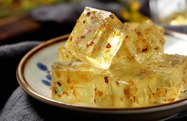 6、冷却后切块,上面淋上糖桂花就可以吃了。