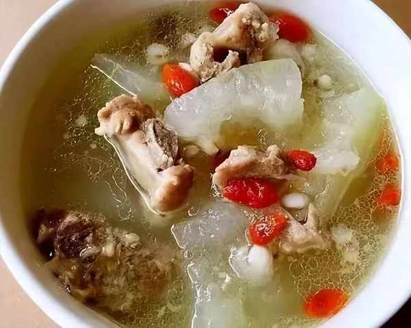 4、砂锅中放入清水700克,下入生米和薏米煮开,放入排骨和沸水200克再煮(在煮的过程中要常搅动,以免黏锅),待水煮至原来的1/2时,倒入200克沸水再煮,直到将米浆米油煮出,将其中1/2的米粒捞出,继续加入200克沸水煮,直到米粒成分裂状,加入200克沸水煮开,放入备好的冬瓜,煮至米粥刚好浓稠时,放入枸杞、姜丝、芹菜末拌匀即可。