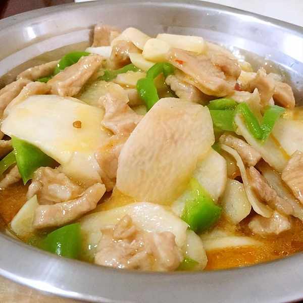 食材:山药150克,肉片200克,彩椒、木耳少许,油、盐、葱姜、淀粉、胡椒粉、糖、鸡精