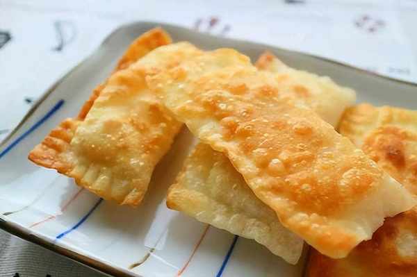 3、取一张馄饨皮刷满黄油再放一张馄饨皮刷黄油直到放上第三张成一组,表面不刷黄油。取适量苹果馅放到中间,上面盖上一组馄饨皮,四周压紧粘合用叉子压出花纹;