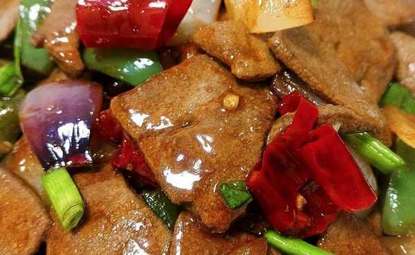 材料:猪肝、淀粉、料酒、生抽、盐、糖、姜、蒜头、青椒、红椒、洋葱、干辣椒、青蒜叶