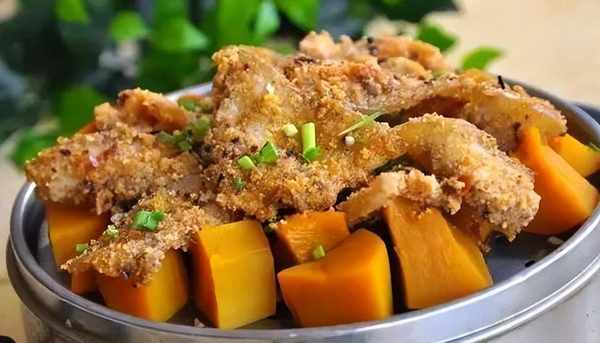 3.将拌匀的五花肉和糯米放到盛有南瓜的碗里,上笼蒸制,一个小时左右取出扣到盘子即可。