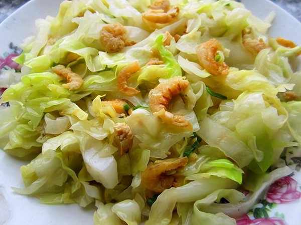 3、起锅热适量油,倒入虾米爆香,放入卷心菜;