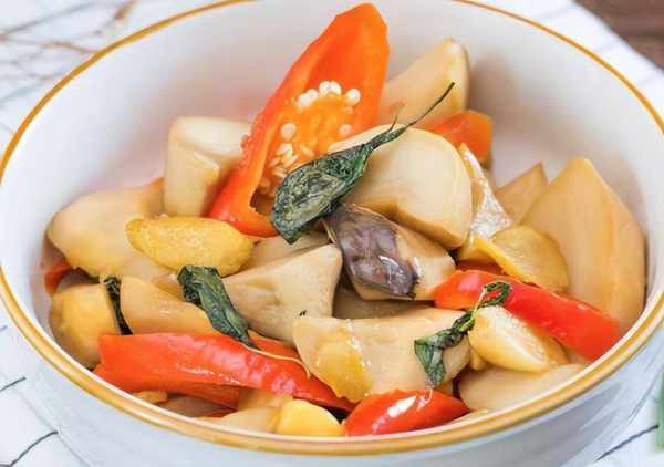 材料:杏鲍菇、红尖椒、九层塔叶、姜、蒜头、生抽、米酒、麻油、冰糖