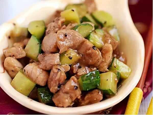 5、炒锅里留一点底油,放入甜面酱翻炒至颜色发红,加入料酒、白砂糖,放入炒好的里脊肉丁和黄瓜丁翻炒均匀,淋入香油出锅即可。