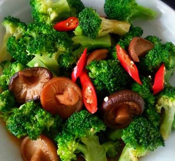 4、把西兰花围着盘子摆放成圆形,锅中倒入适量的油烧热后放入香菇翻炒至变色。