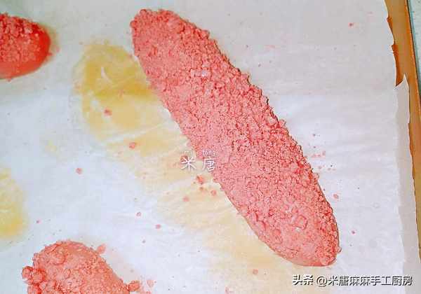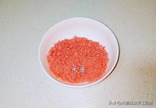 7.松弛时间制作酥粒。黄油稍稍软化,将酥粒材料混合,用手搓成粒状,放入冰箱冷藏。我用的红曲粉+红色素,有草莓粉的直接用草莓粉,颜色更好看。