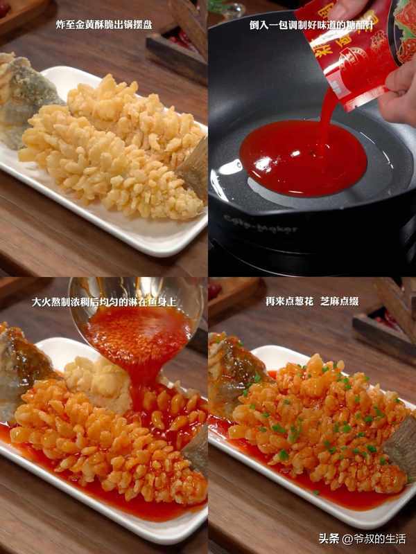 锅中放少许油,倒入糖醋汁(超市有卖),熬至浓稠状后均匀地倒在鱼肉上。