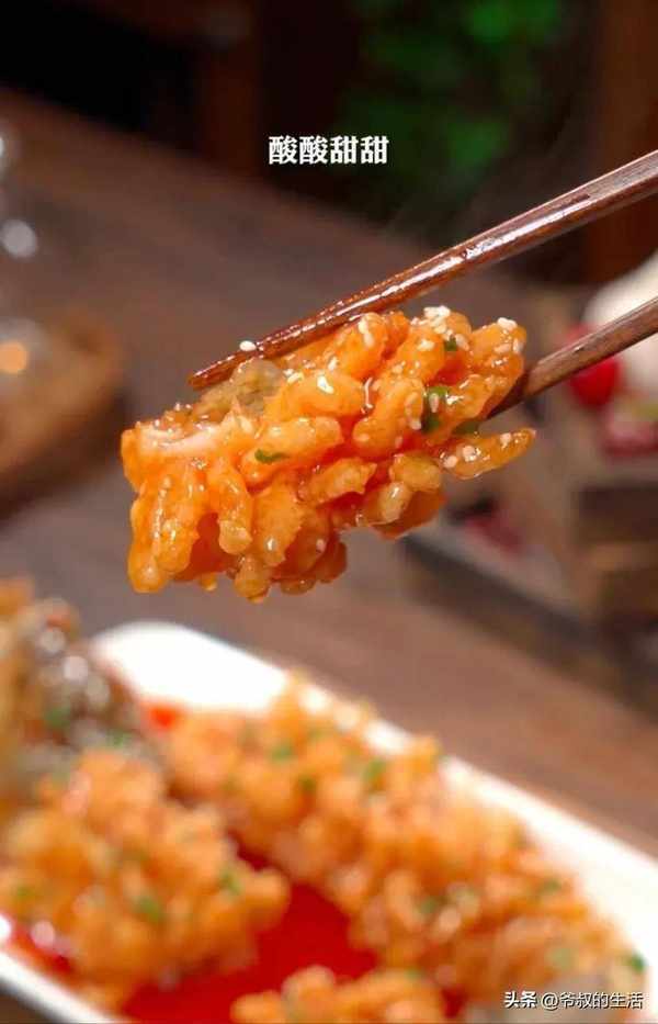 (自制糖醋汁:一勺淀粉、两勺白醋、三勺白糖、四勺番茄酱、五勺清水搅拌好。热油放入调好的汁熬至浓稠即可,依喜好可对配料增减)