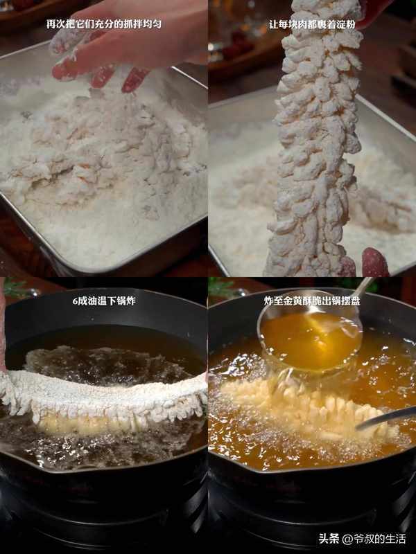 然后放入淀粉中(任何淀粉都可以,我习惯用玉米淀粉)充分地抓拌均匀,让每块鱼肉都裹上淀粉。